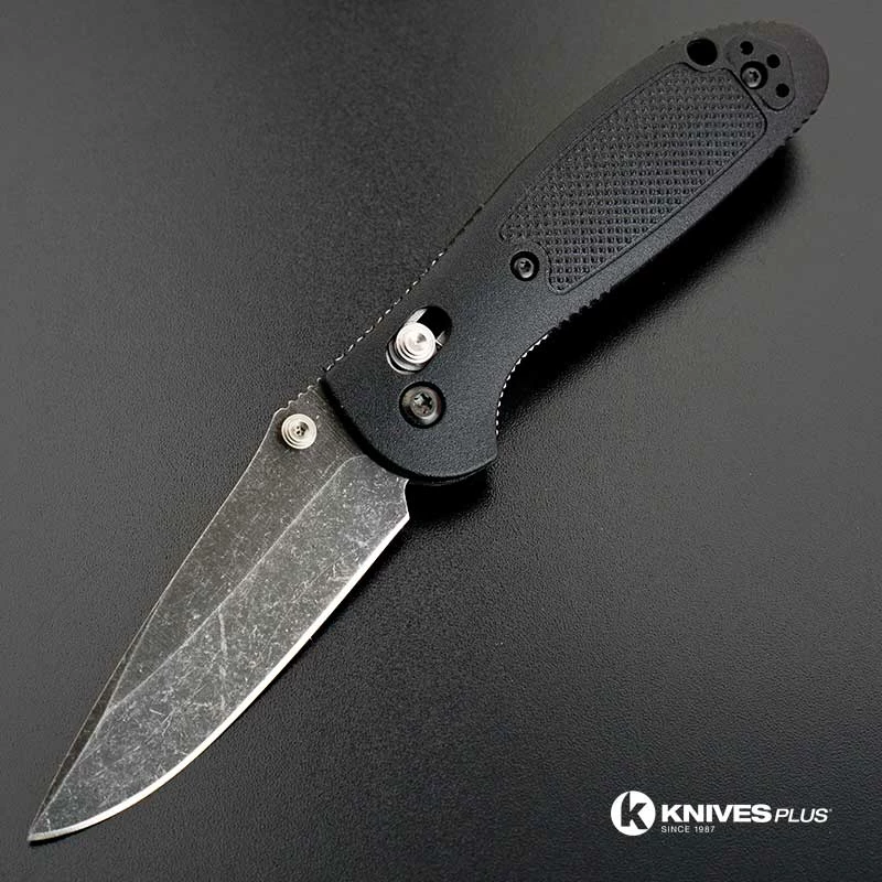 The illustrated MODIFIED Benchmade Knife is the Benchmade Mini Griptilian Knife, designed by Mel Pardue. This Mini Griptilian knife features a 2.91″ ACID STONEWASHED modified drop point blade made of S30V stainless steel, .100″ thick, with a Rockwell hardness of 58-61. The ACID STONEWASHED blade of this Benchmade knife has a hollow grind, a notched thumb rest for secure grip, and dual thumb studs for ambidextrous one hand opening. The BLACK glass filled nylon handle, 3.87″ closed, has double stainless steel liners, ambidextrous AXIS lock and a lanyard hole. A side to side reversible steel pocket clip is mounted at the butt end of this Benchmade knife. The MODIFIED Benchmade Mini Griptilian Knife with ACID STONEWASHED modified drop point blade and BLACK handle has an overall open length of 6.78″, and weighs 2.56 ounces. Made in the USA.