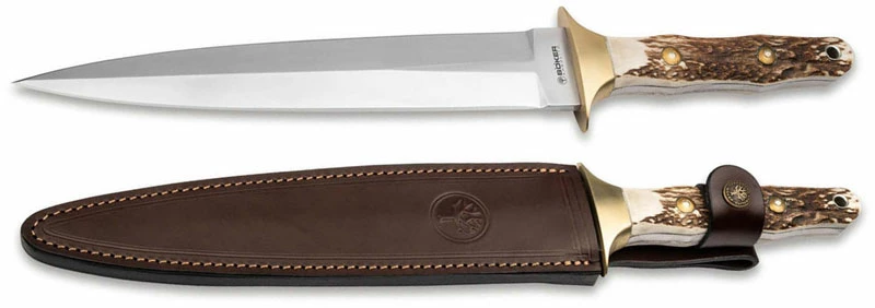 From Boker: The Boker Arbolito Colmillo is a classic Deer Hunting Knife supplied with a long dagger blade and impresses even experienced hunters with its sturdy full tang construction and considerable size. The double-edged blade is made of ACX 390 with an impressive satin finish, the protruding hand guard is made of nickel silver. Genuine stag is used for the ergonomically shaped handle scales, which further emphasises the traditional look of the knife. With lanyard hole and high-quality brown leather belt sheath.