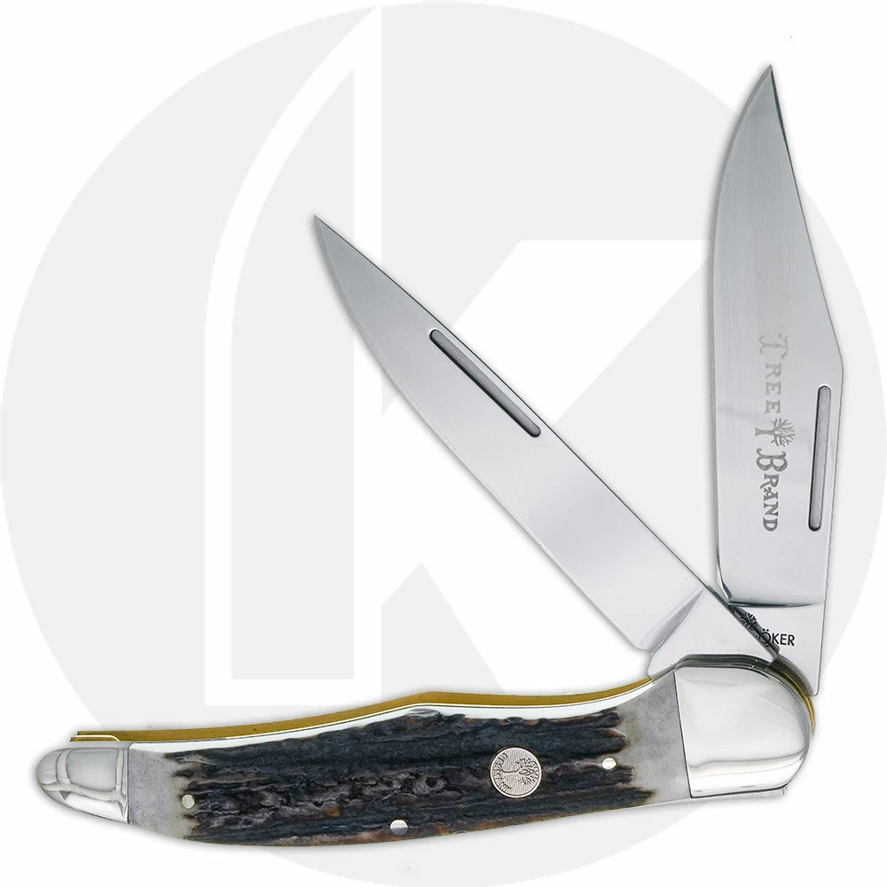 The 110840ST Boker Folding Hunter Knife, part of the Boker Traditional Series 2.0, is a classic hunting knife that features clip and skinner blades made of tough D2 tool steel with nail nicks for opening. The genuine stag handle, 5 1/4 inches closed, has brass liners, round Tree Shield and nickel silver bolsters. A genuine leather sheath is included. The Boker Folding Hunter Knife weighs 5.3 ounces. Imported from Germany.