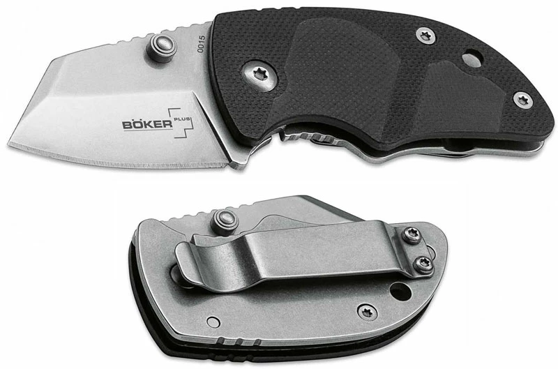 From the Boker website: With its size ranging between the DW-1 and the classic Sucom, the DW-2 with its modified Wharncliffe blade is the implement of choice for small to medium cutting cores. Here as well, Chad Los Banos surprises us with the superior ergonomics he is able to incorporate into his unique designs even on a knife of this size. It features a steel frame lock with zytel front scales and a removable clip (tip up).