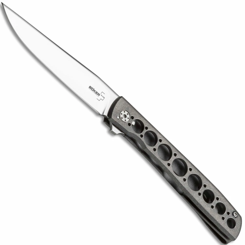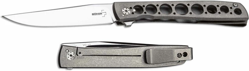 From the Boker website: … At a mere 8 mm grip thickness (without clip), the term “slim” only inadequately characterizes the Urban Trapper for its usable size. The large holes in the titanium handle transform the Urban Trapper into a true lightweight that can be extremely conveniently carried in a suit pocket or light summer trousers alike. Considering the minimalist overall design of the knife, the size of the flipper is equally sparing. When used, it impresses nevertheless with its outstanding functionality, and reliably opens the ball bearing hinged VG-10 blade. The blade shape of this classic trapper pocket knife, widely distributed throughout the US and worn by Brad Zinker for many years, was the inspiration for this unusual piece. …