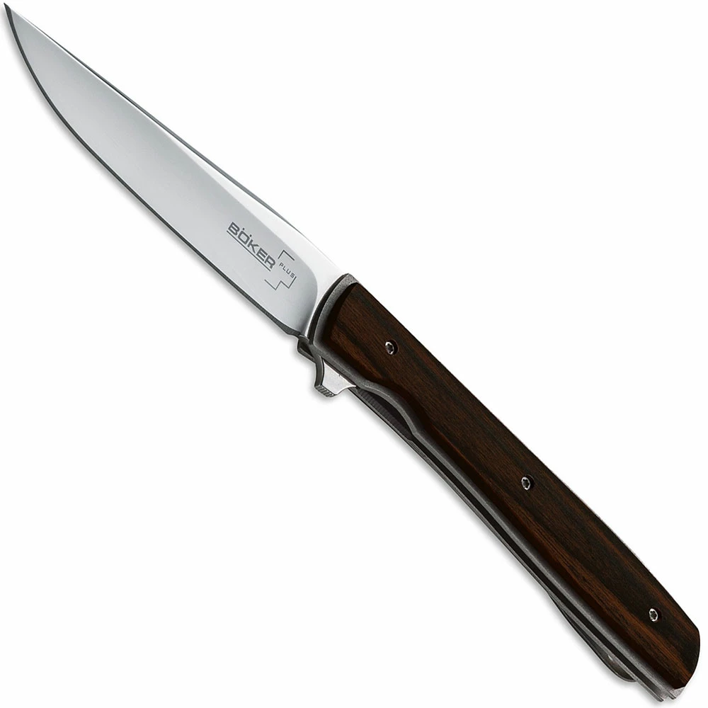 The illustrated Boker Knife is the Boker Plus Urban Trapper Knife, designed by Brad Zinker, that features a 3 1/2″ clip point blade made of VG10 stainless steel. The blade of this Boker Knife has a satin finish, a flipper and IKBS (Ikoma Korth Bearing System) for smooth ambidextrous one hand opening. The titanium handle, 4 1/4″ closed, has a stonewash finish, genuine Cocobolo wood scales and a liner lock. A low carry stonewashed metal pocket clip is mounted at the butt end of this Boker Knife. The Boker Plus Urban Trapper Knife with Cocobolo wood handle scales has an overall open length of 7 3/4″, and it weighs 1.8 ounces. Imported from China.