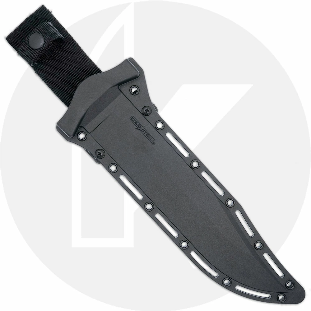 The FX-LTHRNK Cold Steel Leatherneck Bowie Knife features a 10 1/2 inch clip point fixed blade made of tough D2 steel with a black powder coated finish and fullers to lessen weight. The Leatherneck Bowie has full length tang construction for strength, grooved and checkered black Kray-Ex grip for secure purchase and a steel cross guard and pommel. A Secure-Ex sheath is included. The Cold Steel Leatherneck Bowie knife has an overall length of 15 inches.