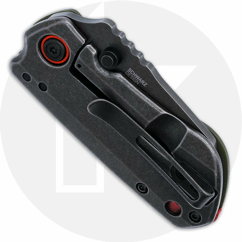 The 6277 CRKT Overland Compact Knife, designed by TJ Schwarz of Boise, Idaho, is a mini bulldog of an EDC that features a 2.24 inch sheepsfoot blade made of tough D2 tool steel, .13 inches thick, with a non reflective black stonewash finish, a notched thumb rest for secure grip and dual thumb studs for ambidextrous one hand opening. The handle, 3.19 inches closed, has a textured green G10 front, black stonewash stainless steel back, bright orange pivot ring and notched backspacer for visual interest, a sturdy frame lock, lanyard hole and a removable stainless steel pocket clip mounted at the butt end. The Overland Compact Knife has an overall open length of 5.41 inches, and it weighs 3.1 ounces.