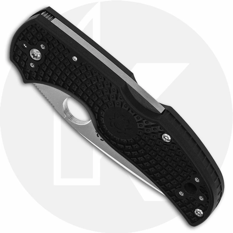 The illustrated Spyderco Knife is the Spyderco Native 5 FRN Knife that features a 2.95″ spear point blade made of CPM S30V stainless steel, .125″ thick. The blade of this Spyderco knife has a matte finish, a flat grind, a subtle top swedge, a notched thumb ramp for secure grip, and the Spyderco hole for ambidextrous one hand opening. The contoured black FRN (fiberglass reinforced nylon) handle, 4.00″ closed, has a lockback and a large lanyard hole. A four position steel pocket clip is included with this Spyderco Knife. The Spyderco Native 5 FRN Knife has an overall open length of 6.95″ and it weighs 2.5 ounces. Made in the USA.