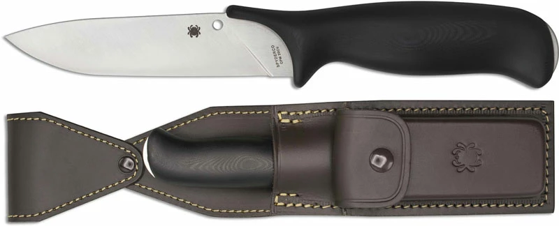 The Spyderco Zoomer Knife – a bushcraft style tool designed by survival enthusiast Thomas Zoomer, features a 5.20″ drop point blade made of CPM 20CV stainless steel with a zero ground convex (Hamaguri) grind and a satin finish. The Zoomer has full length tang construction; ergonomic black G10 handle with extended thumb rest for secure grip, and an extended pommel (suitable for use as a light hammer) with integral lanyard hole. A genuine leather belt sheath with ceramic sharpening rod and accessory pouch is included. The Spyderco Zoomer Knife has an overall length of 10.0″, and it weighs 9.6 ounces. Made in Taiwan.